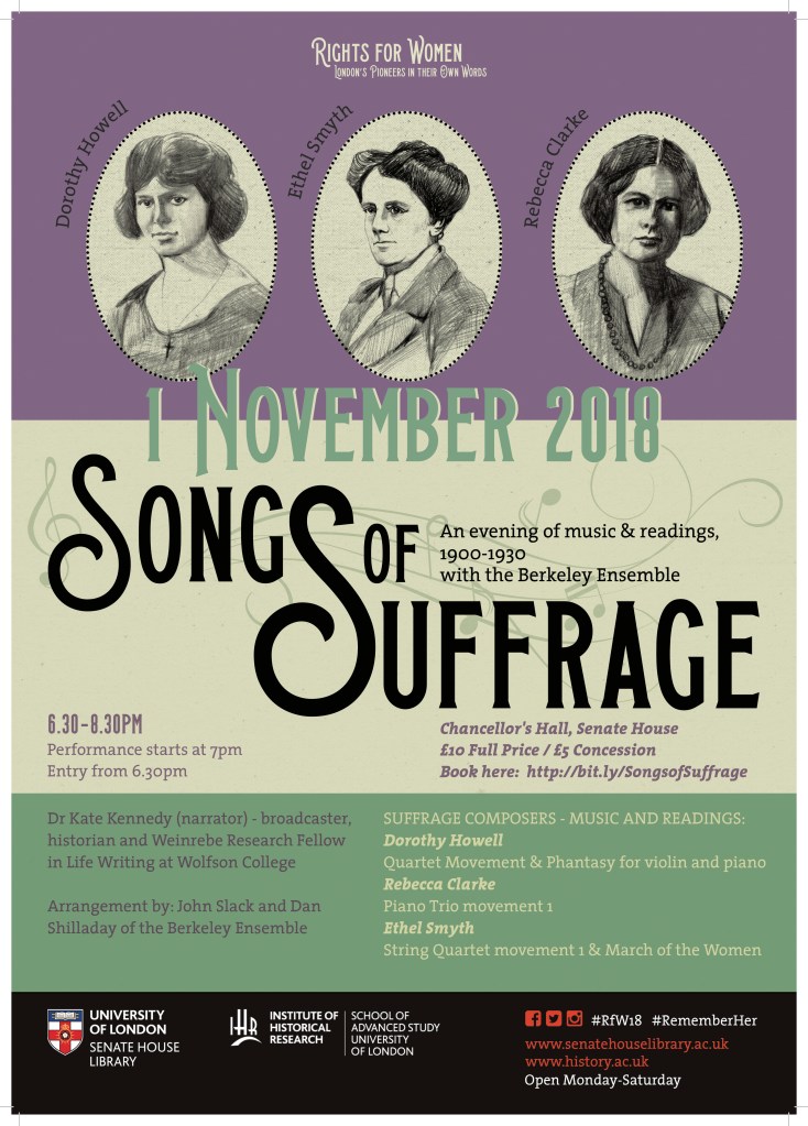 The concert forms part of Senate House Library’s Rights for Women: London Pioneers in their Own Words exhibitionand events season & IHR’s Suffrage Season, 1918-2018.